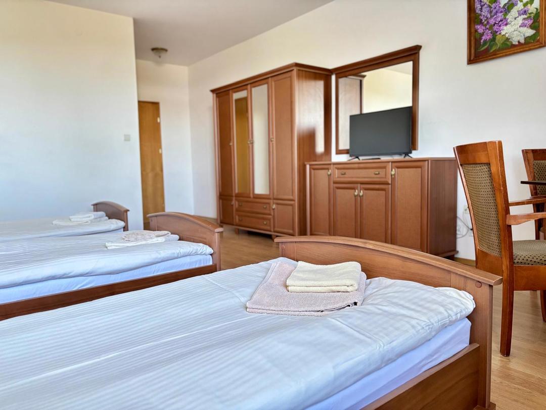 Nasze pokoje i domki zostały wyposażone z myślą o Twojej wygodzie. W każdym z nich znajdziesz dostęp do Wi-Fi, telewizor, prywatną łazienkę, świeże ręczniki, czajnik bezprzewodowy oraz komplet szklanek — wszystko, czego potrzeba, by poczuć się swobodnie. Dodatkowo, wybrane domki i apartamenty oferują aneks kuchenny lub kuchnię, lodówkę, a nawet kominek, który doda ciepła i klimatu podczas wieczornego relaksu.